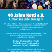 „40 Jahre – 40 Boxen. Kiek mal rin! 40 Jahre Nachbarschaft!“ am Freitag, 30.1. um 18 Uhr im Familiengarten #40JahreKotti