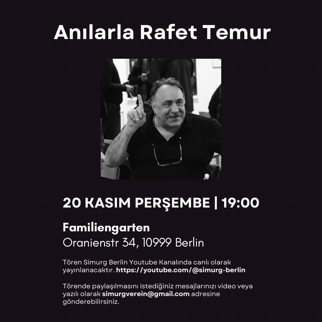 Simurg Berlin e.V.: Anılarla Rafet Temur Kalender Wann: 20. November 2025 um 19:00 – 21:00 2025-11-20T19:00:00+01:00 2025-11-20T21:00:00+01:00 Wo: Familiengarten https://kotti-berlin.de/wp-content/uploads/2021/08/kotti-logo-blau.png 0 0 monique https://kotti-berlin.de/wp-content/uploads/2021/08/kotti-logo-blau.png monique2025-10-27 13:38:052025-11-10 12:03:33Simurg Berlin e.V.: Anılarla Rafet Temur