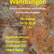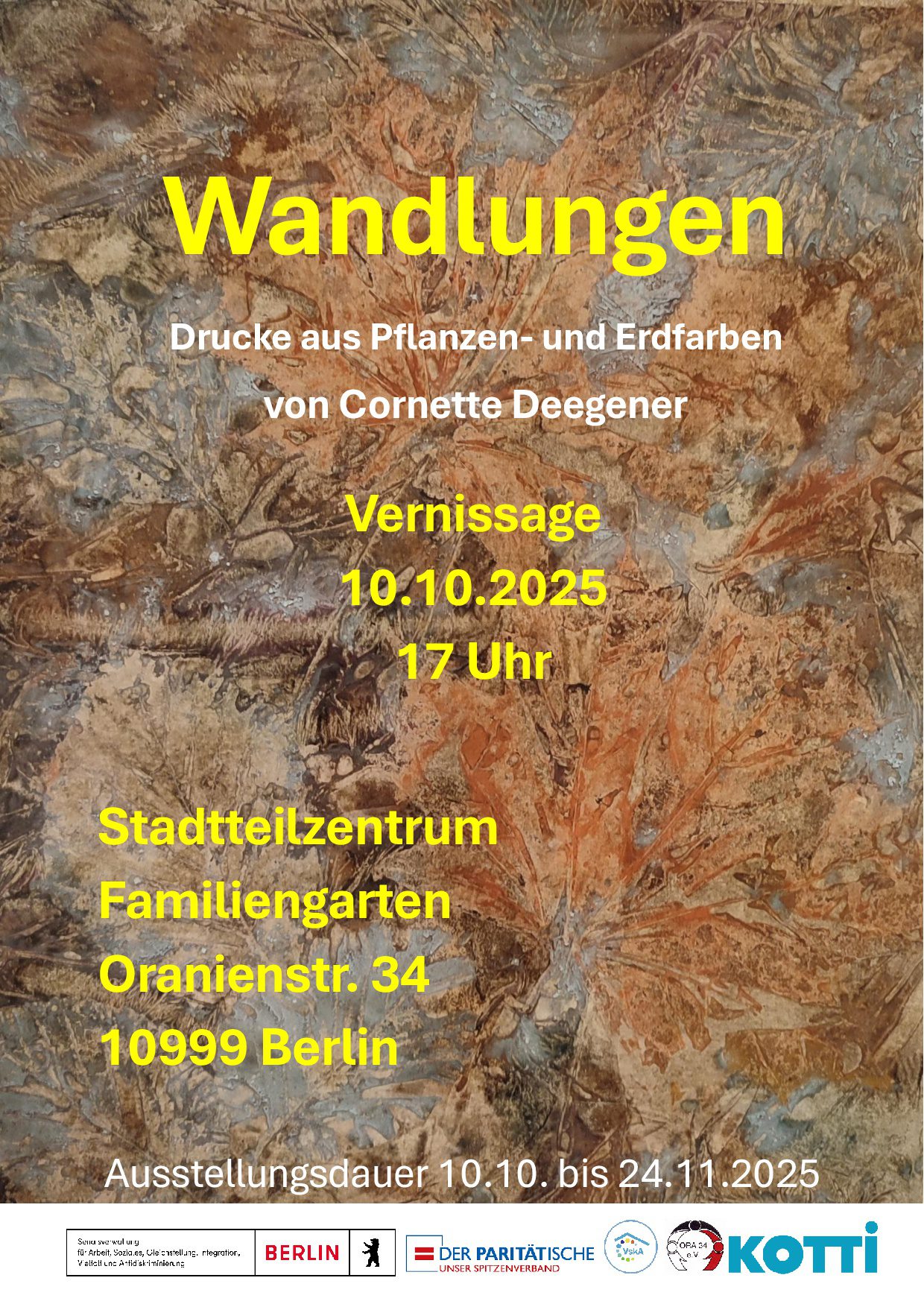- Vernissage: „Wandlungen“ - Drucke aus Pflanzen und Erdfarben von Cornette Deegener am 10.10. um 17 Uhr im Familiengarten